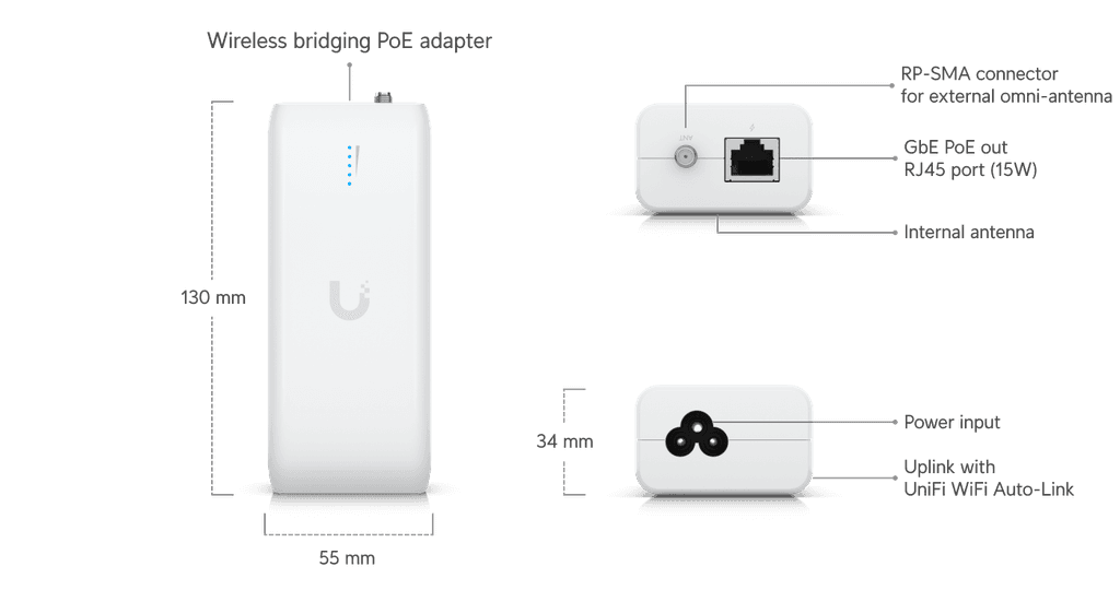 Description: Plug-and-play, wireless bridging PoE adapter with integrated UniFi WiFi Auto-Link.